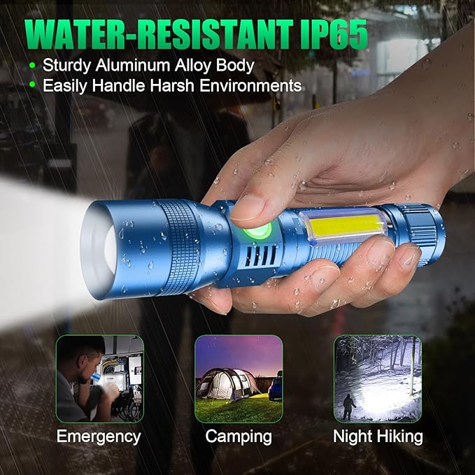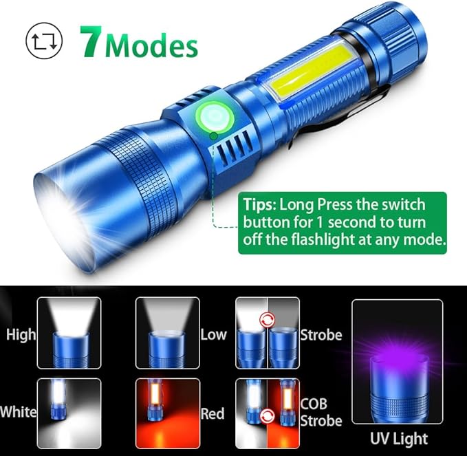 - 7 Modes, One key turn off: LED lighting is a combination of white and purple light. This product can be used for lighting or object detection. 1000 lumen that could light up to 600ft, it could be fully zoomable from large area floodlight to focus spotlight. In addition, This product has 7 different light settings, High, Low, Strobe, COB Side Whitelight, COB Redlight, and a COB White, Red flash, and High UV light. (one key turn off, You can long press to turn off the flashlight in any mode.)