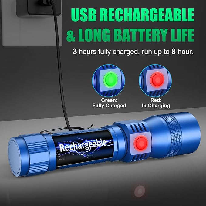 - USB Rechargeable Flashlights : Adopt large-capacity rechargeable. The flashlight can be charged by usb, or it can replace the prepared. The overall life of the flashlight is about 70,000 hours. It can be used for 8 hours after a single charge. The button will display a red light when the power is low, and a green light when the charge is complete. flashlight with UL Listed and upgrated version of overcharge protection, the flash light will stop charging when it fully charged, Safe and worry free