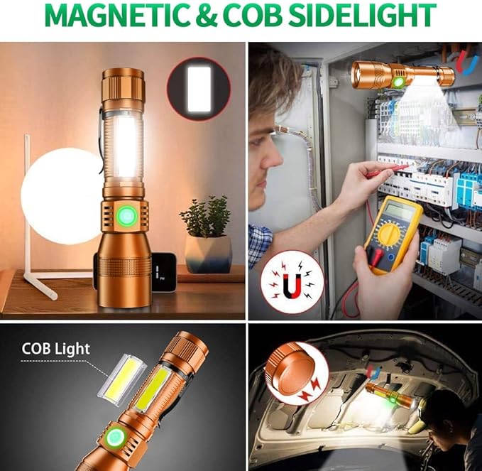 - 395nm uv light with Magnetic base: With uv ultraviolet light, you can clearly see the stain watermark, pet urine, harmful insects and animals, and verify banknote documents. The led flashlight comes with a cob tool light, magnet flashlights. When two hands are required for operation, it can be attached to the metal and the cob light is used for auxiliary operation. The cob light also comes with red or red and white flashing light, which can achieve the warning effect.