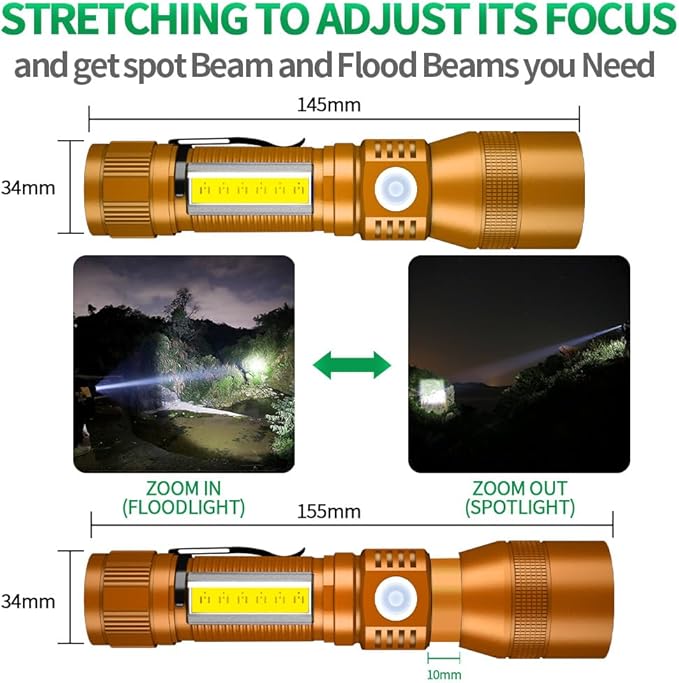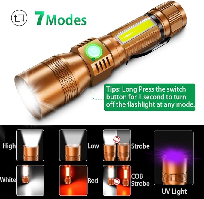 - 7 Modes, One key turn off: LED lighting is a combination of white and purple light. This product can be used for lighting or object detection. 1000 lumen that could light up to 600ft, it could be fully zoomable from large area floodlight to focus spotlight. In addition, This product has 7 different light settings, High, Low, Strobe, COB Side Whitelight, COB Redlight, and a COB White, Red flash, and High UV light. (one key turn off, You can long press to turn off the flashlight in any mode.)