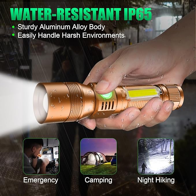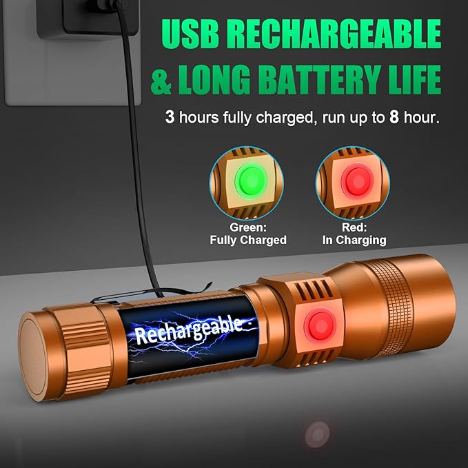 - USB Rechargeable Flashlights : Adopt large-capacity rechargeable. The flashlight can be charged by usb, or it can replace the prepared. The overall life of the flashlight is about 70,000 hours. It can be used for 8 hours after a single charge. The button will display a red light when the power is low, and a green light when the charge is complete. flashlight with UL Listed and upgrated version of overcharge protection, the flash light will stop charging when it fully charged, Safe and worry free