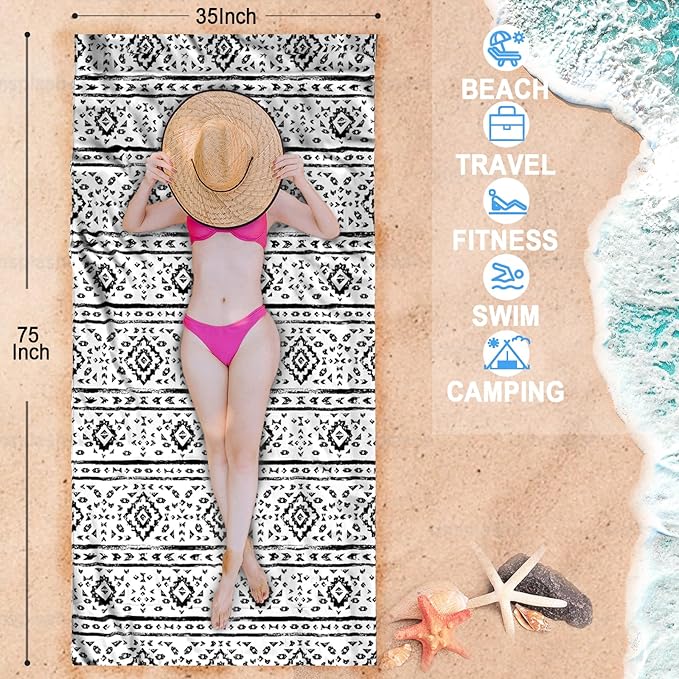 Bnuitland Black and White Boho Pattern Beach Towel (35X75 inches), Oversized Quick Dry Absorbent Sand Free, Cute Towels for Travel Swimming Pool Picnic, 90% Polyester and 10% Polyamide