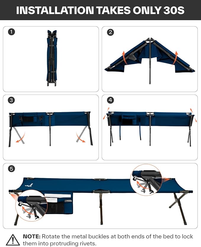 - 30s Instant Installation: With easy-to-use design, you can set up the camping cot for adults in seconds without any risk of injury, even a novice. And don't worry about stability - our cots for sleeping features a leg rotation lock that provides extra support and security. It's so easy to use that even kids can set it up without any trouble. Plus, the bonus 3-in-1 storage bag perfectly keeps all your camping essentials organized and within reach--- phone, keys, water bottle, or glasses and more.