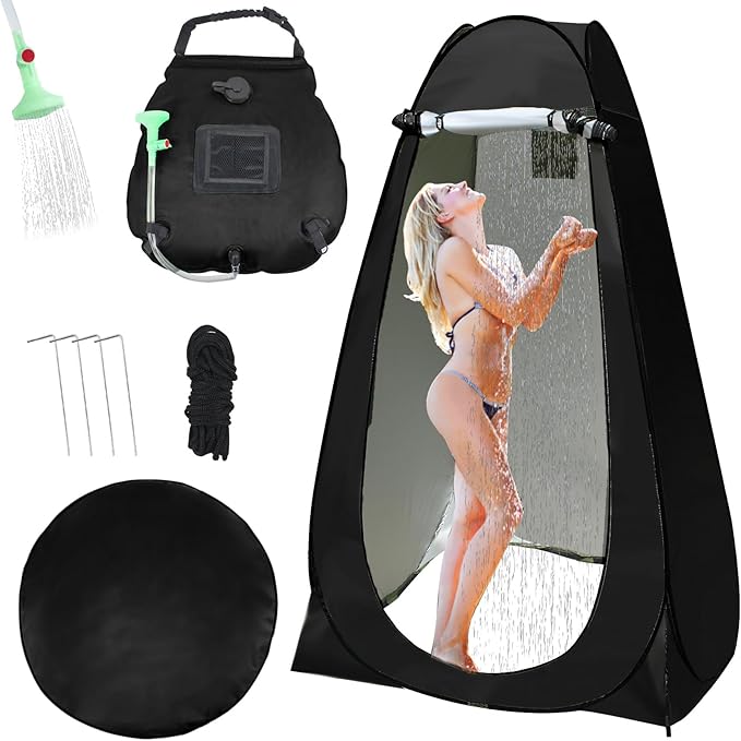 • 【Multi-Purpose】Portable privacy tent for outdoor can provide you with a clean and private space anytime, anywhere. Our portable privacy tent is fully equipped to make sufficient preparations for going out, including 1x Camping Shower Tent, 1 x Carrying Bag, 4 x Metal Mounting Stakes, 4 x Windbreak Rope, 1 x Solar Shower Bag. You can take this practical , convenient and pop up tent, for changing clothes, camping, beach, shower, toilet,hiking,taking pictures or anywhere you need privacy.