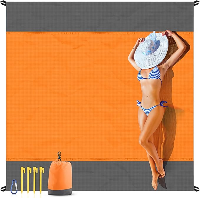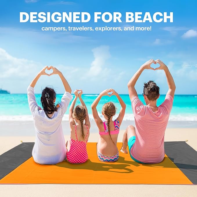 - LARGE SIZE DESIGN: The extra large beach mat is specially designed for family travel, providing enough space to lie down, rest and relax. Beach mat waterproof set includes 1 beach blanket, 4 stakes, 1 carabiner. Beach blanket measures 79" x 83", sleeps up to 7 adults, and weighs 12 oz.