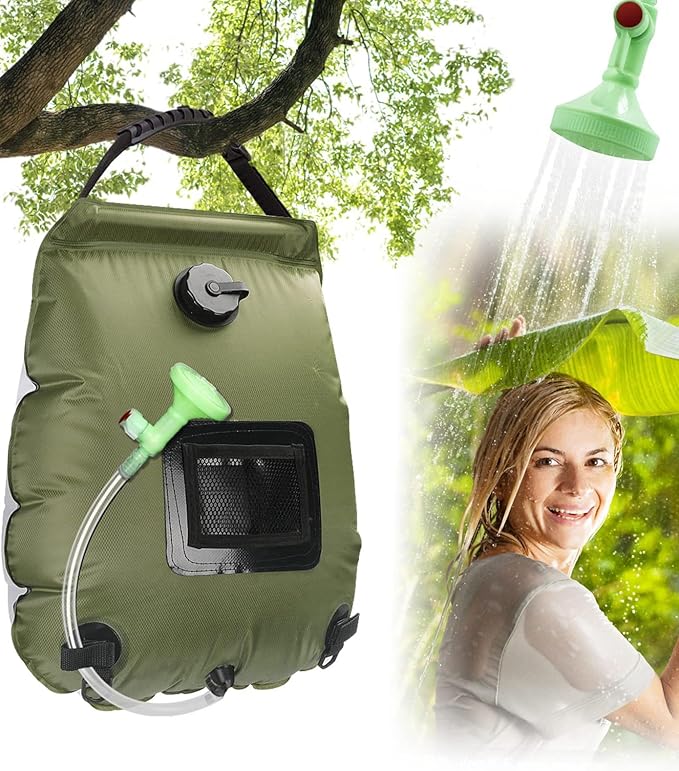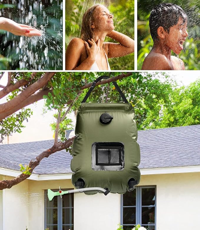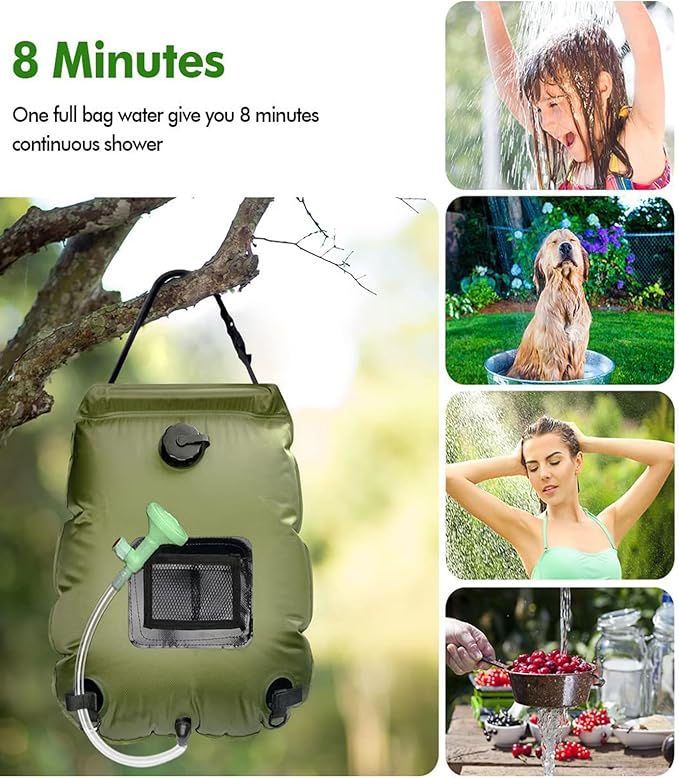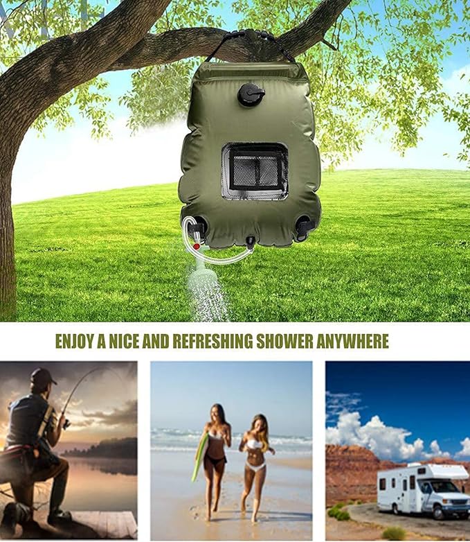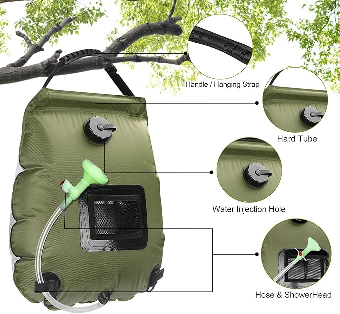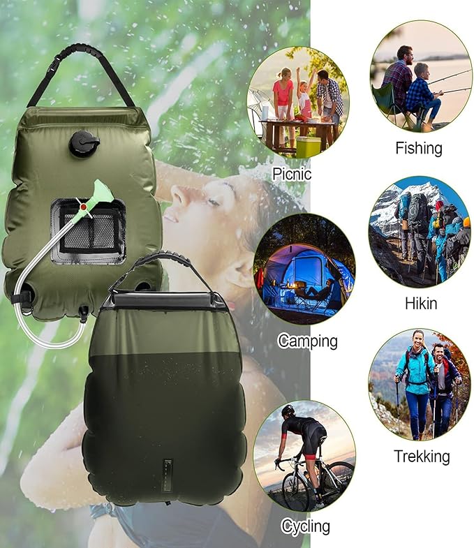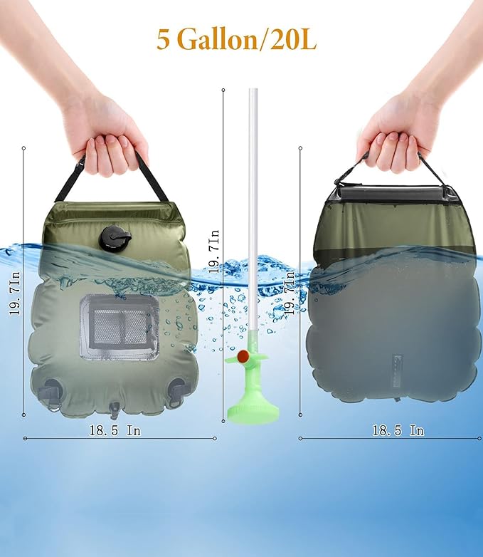 - ★【Compact & Lightweight】 With a larger water capacity of 5 gallons/20L, the solar shower bag is enough for about 3 showers. The water flow is fine and gentle to let you enjoy a better and refreshing shower anywhere, bringing you a better shower experience! Besides, our camping shower is so compact and lightweight that you can carry it in your backpack conveniently. The shower bag is only 0.98 Lbs and just 13x6x2 inches in package.