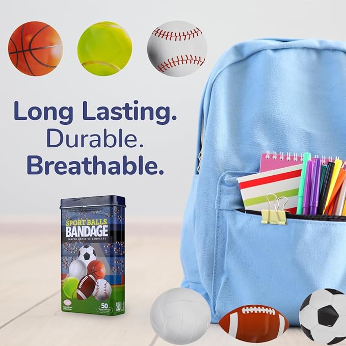 - SPORT BALL BANDAGES: This 50 piece tin of Sports Balls bandages feature fun baseball, football, volleyball, tennis ball, soccer ball, and basketball shapes, and is great for putting a smile on kids' faces while protecting wounds such as cuts, scrapes, and burns; sticky bandages come in a cute cardboard box and are perfect for kids and adults alike, and also for school nurses and pediatric doctors