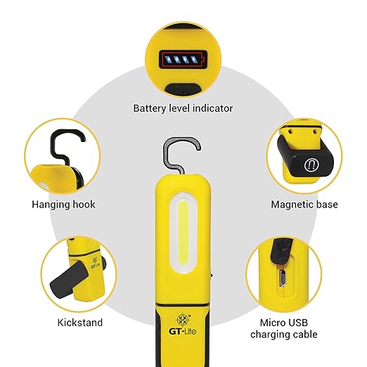 LED Rechargeable Work Light 300 Lumen Flash Light, 6ft Cable, Hanging Hook, Magnetic Base, Kickstand, 3 Settings, High/Low/Flashlight, Emergency Kits, Camping Light, Utility, Plumbing Light