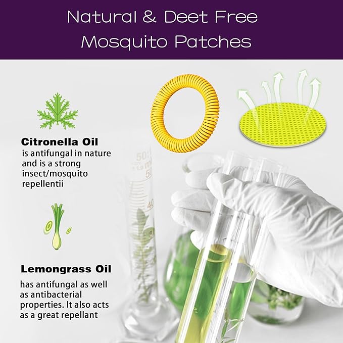 - Natural & 100% DEET-Free: Our Non-toxic mosquito bracelets and patches are made with plant-based natural ingredients, Infused with citronella oil, safe for kids, babies, toddlers, olders, and pregnant women, will effectively keep mosquitoes away from your families.