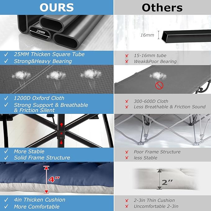 - 【Built-in Pillow Design】The headboard of our cot is a slanted design with built-in pillows, no need for extra pillows. The slight incline is ergonomically designed to ensure no more back, neck or shoulder pain in sleep! The mattress is also soft and thicker, so this is a very comfortable folding camping cot.