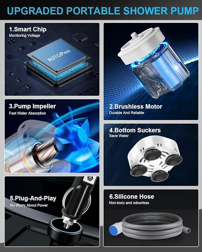 AUTOPkio Portable Camping Shower, Plug-and-Play Camp Showerhead Kit with Brushless Motor Camp Shower Pump for Outdoor Hiking, Rv Travel
