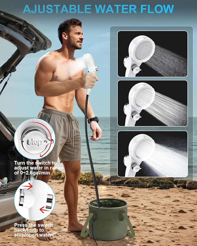 • UPGRADE PORTABLE CAMPING SHOWER -- Portable shower pump is equipped with threaded pump mouth and flexible hose connection ensure that the hose does not pop out when the pump is working. Paired with four small suction cups, it firmly grips the bottom of the bucket for self-stabilisation.