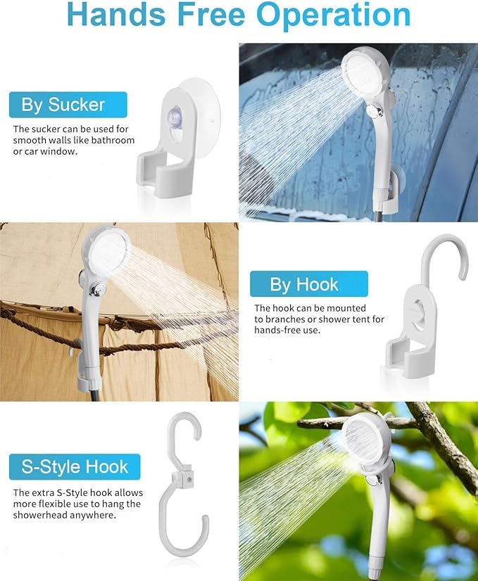 • WHAT'S IN THE BOX -- Shower pump,Adjustable shower head, 4x bottom suckers, Food-grade silicone hose, 1x 5m Adapter cord, 2x Rubber rings (one is originally installed on the hose, the other is for replacement), 1x Showerhead holder, 1x Hook for shower holder, 1x S-shape hook, 1x Storage bag, 1x User manual