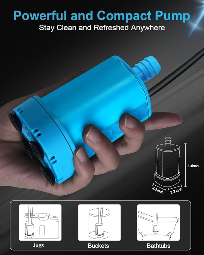 - UPGRADE PORTABLE CAMPING SHOWER -- Portable shower pump is equipped with threaded pump mouth and flexible hose connection ensure that the hose does not pop out when the pump is working. Paired with four small suction cups, it firmly grips the bottom of the bucket for self-stabilisation.