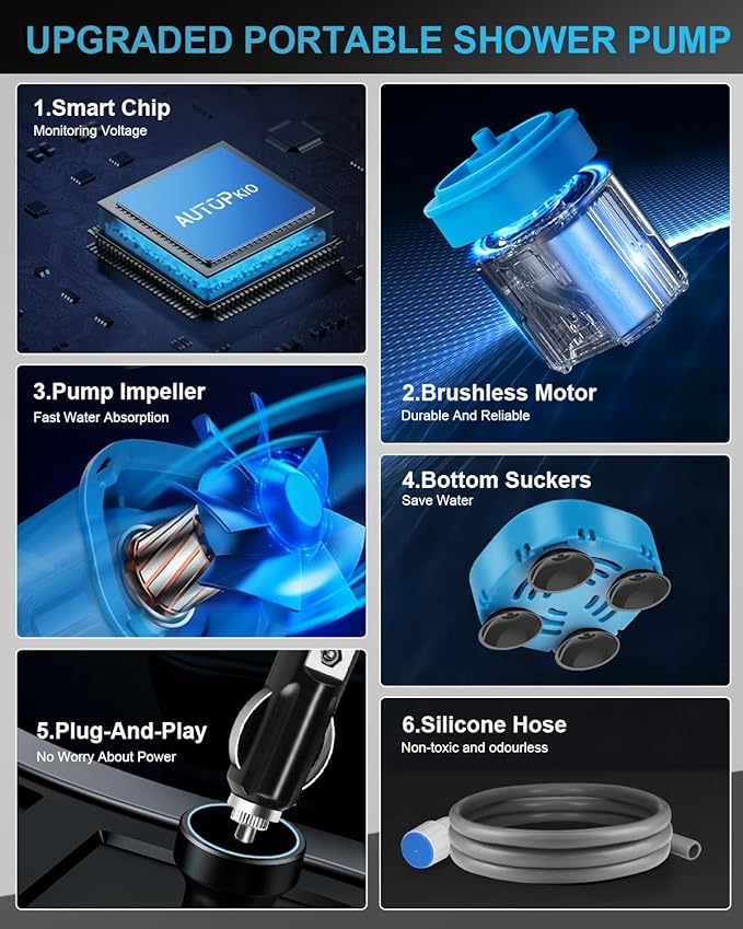 AUTOPkio Portable Camping Shower, Plug-and-Play Camp Showerhead Kit with Brushless Motor Camp Shower Pump for Outdoor Hiking, Rv Travel