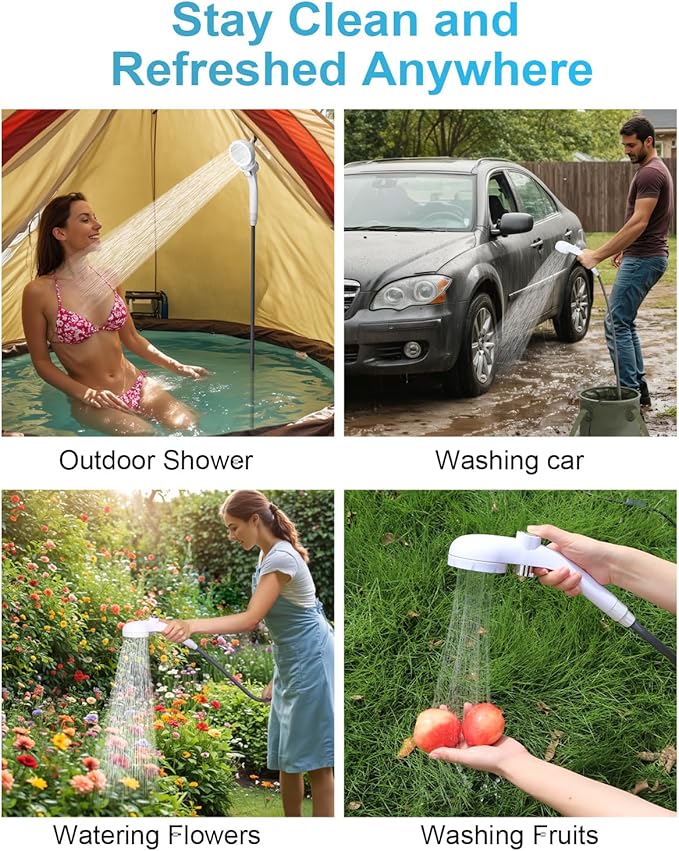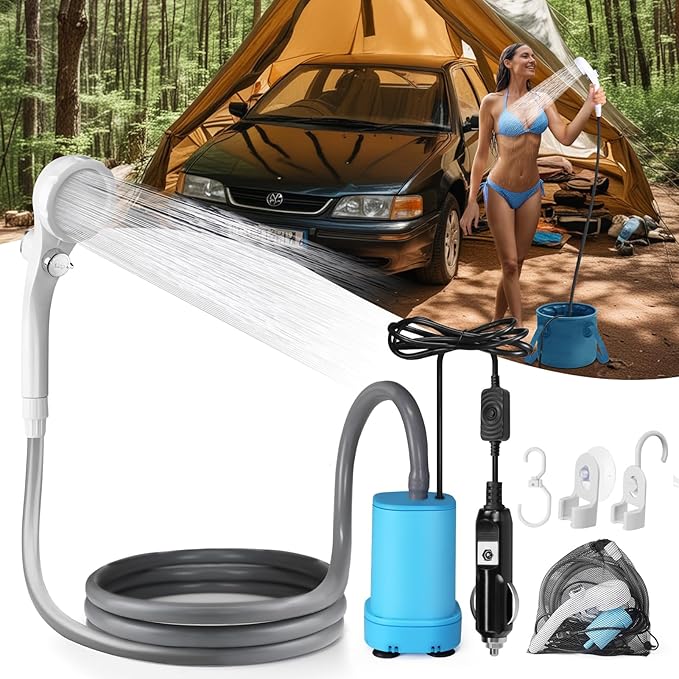 - PLUG-AND-PLAY -- Simply plug into cigarette lighter socket, place the shower pump in your water source, then turn it on to get instant shower stream.Durable brushless motor pump is suitable for family camping, outdoor activities, bathing your dog, watering plants, and emergencies.