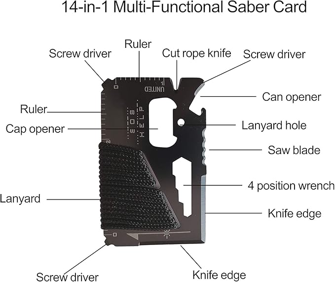 - 14 in 1 Multi purpose survival Pocket tool, including: 3 x Screw driver, 2 x Ruler, Cut rope knife, Can opener, Cap opener, Lanyard,Lanyard hole, 4 position wrench, 2 x Knives.