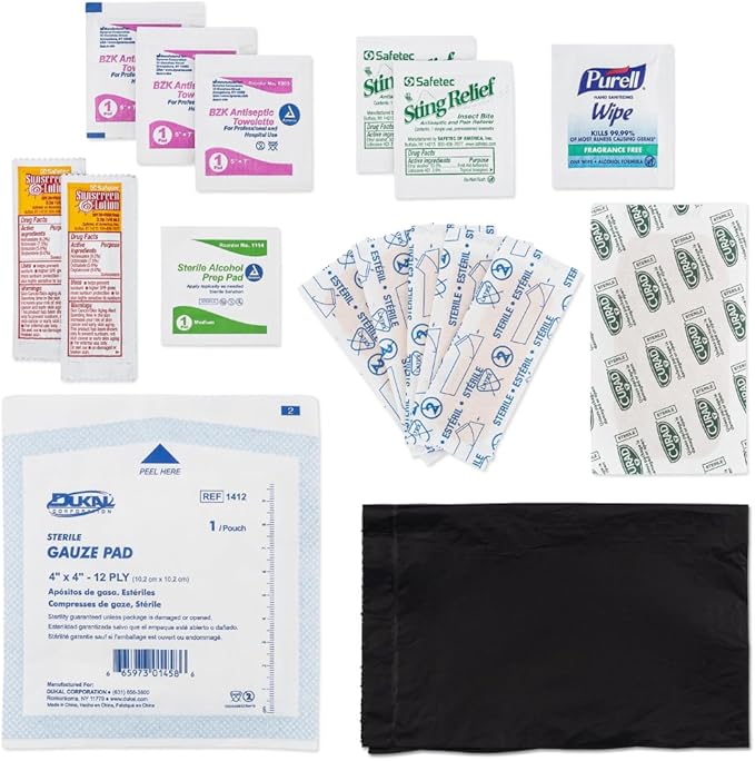 - ESSENTIAL FIRST AID CONTENTS: Packed with essential items, including Sting Relief Wipes, Sunscreen Packets, Standard Band-Aids, Gauze Pad, Hand Sanitizing Wipe, Alcohol Prep Pad, Antiseptic Towelettes, Disposable Bag, and an Extra Large Bandage, ensuring you have the necessary tools for different emergencies.