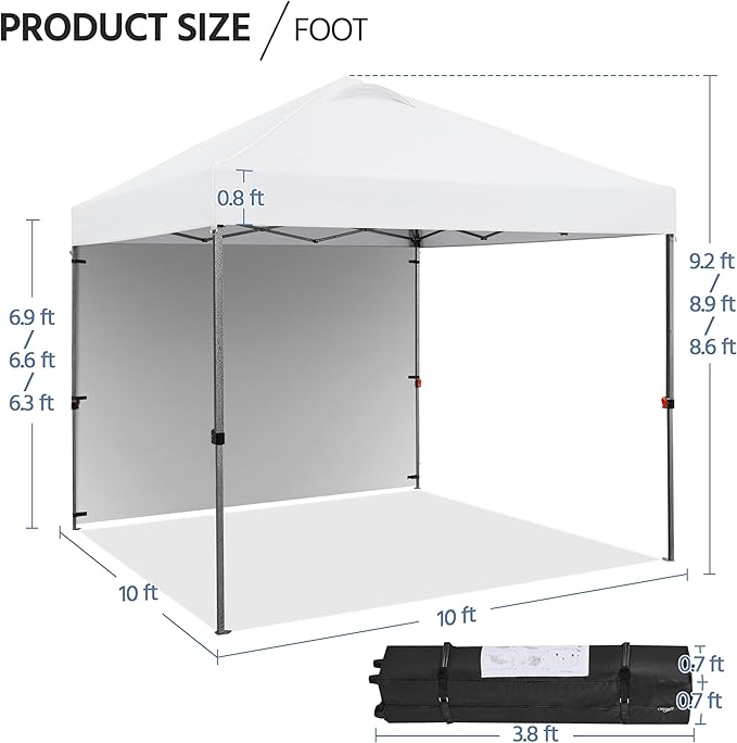 - 3 Heights Switch Smoothly: You can adjust the height of this pop-up canopy to 8.6′, 8.9′, or 9.2′ effortlessly. The upgraded adjustment buttons ensure smooth and secure operation