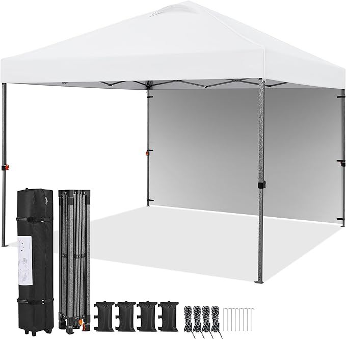 Yaheetech 10x10 Pop up Canopy Tent w/1 Sidewall, Instant Commercial 150D Silver Coated Fabric Outdoor Instant Tent w/Wheeled Bag, 4 Sandbags, 8 Stakes & 4 Ropes for Parties, Camping, Beach, White