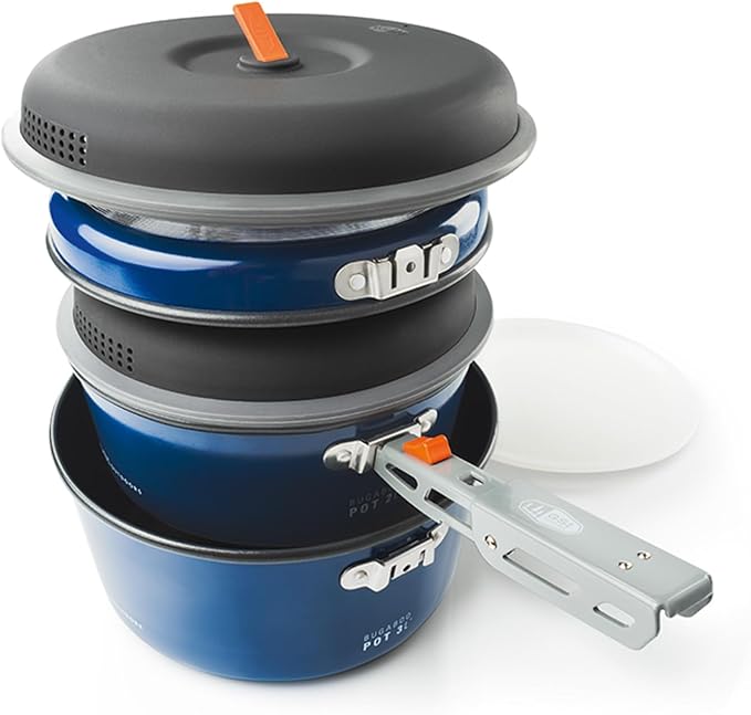 GSI Outdoors Bugaboo Base Camper Medium, High-Efficiency Cookset – Ceramic Non-Stick Coated, Includes 3L & 2L Pots, 8" Fry Pan, Accessories