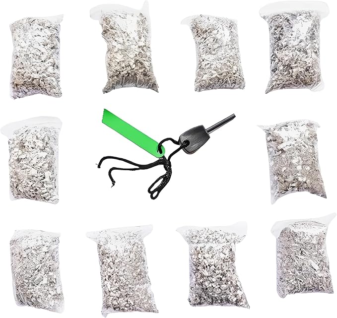- 10 resealable zip closure bags, each bag is packed full of shiny new shaved, shreds, chips, spiral magnesium without oxidation, the bag is 3 1/6 x 2 1/2 inch.
