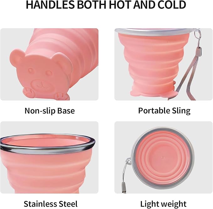 - 🥛【Outstanding Design Mugs Cup】The bottom design makes collapsible cup easy to use and more stable when it is placed on a flat surface. The mouth of the mug cup is reinforced with a stainless steel rim, that doesn't collapse or flop around. The rope and portable hook let the cup could hang on your bag while you travel outside. Tight lid prevents any dust and dirt drop in your cup.