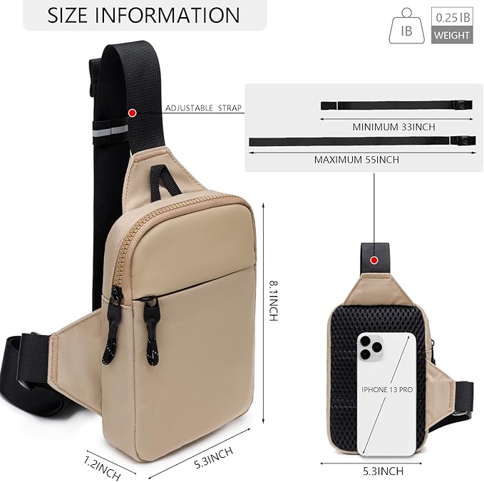 - Sling Bag Size & Adjustable Strap: Small crossbody sling bag size is 5.3 x 8.1 x 1.2 inches (0.25lb). The wide nylon shoulder strap can be adjusted from 31'' to 55.1''.Suitable for different body types. You can adjust the strap according to fit to make daily use more comfortable