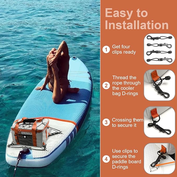 - 【Easy Installation】The MoiShow paddleboard cooler comes with four clips that easily secure via D-rings that attach to your paddle board. Bseides, it includes two longer elastic lanyards to ensure a secure fit on your paddle board, kayak, or any other occasion.