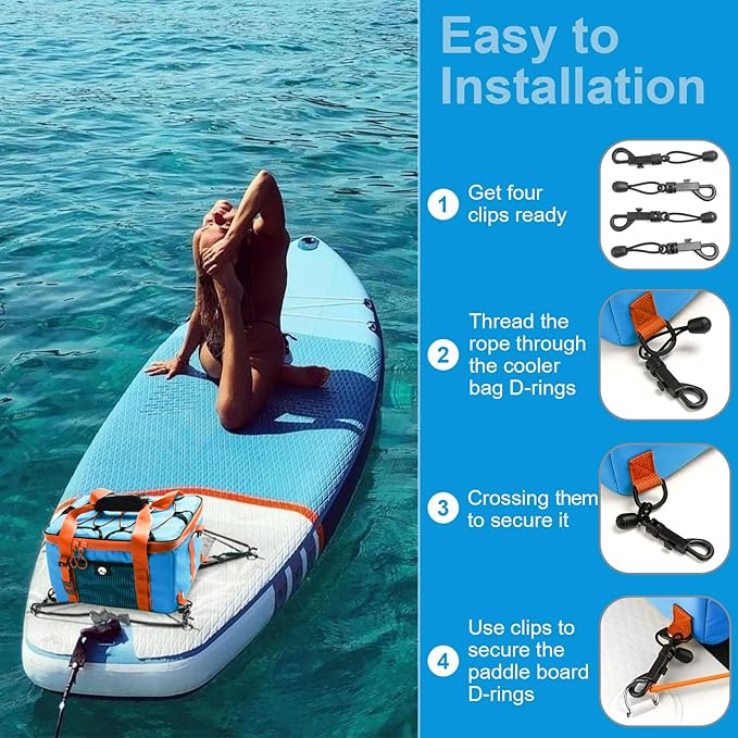 - 【Easy Installation】The MoiShow paddleboard cooler comes with four clips that easily secure via D-rings that attach to your paddle board. Bseides, it includes two longer elastic lanyards to ensure a secure fit on your paddle board, kayak, or any other occasion.