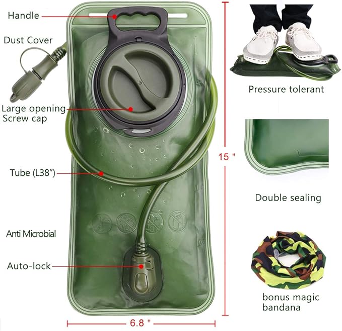 - Remain hydrated: This hydration bladder 2L can withstand temperatures from 20 to 50 degrees celsius; the tube resists temperature changes in hot and cold weathers; L 14.2'' x W 6.8'' water bladder is compatible with most hydration pack; the tube, 0.4” diameter and 40” long, provides a wholesome flow for easy drinking, keeping you hydrated when camping, biking, cycling, hiking, or running
