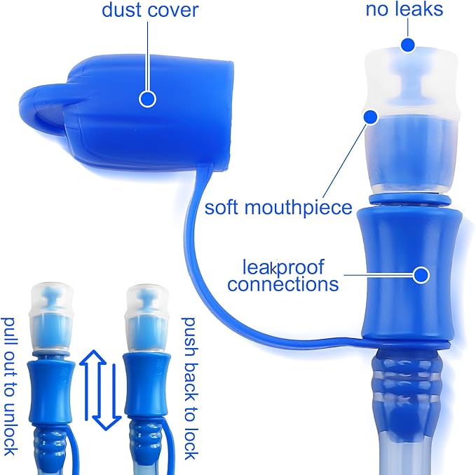 - Well-sealing water bladder: You won't be slowed down with our high flow bite-valve; simply bite the mouthpiece to suck water; soft mouthpiece with easily accessible valve; it also has a cover to keep dirt out; conveniently control the water flow by biting; quick-release tube is detachable; while the tube is removed, the connnector automatically shut off and the hydration bladder will stay filled; store neatly in fridge/icebox without tangling hose