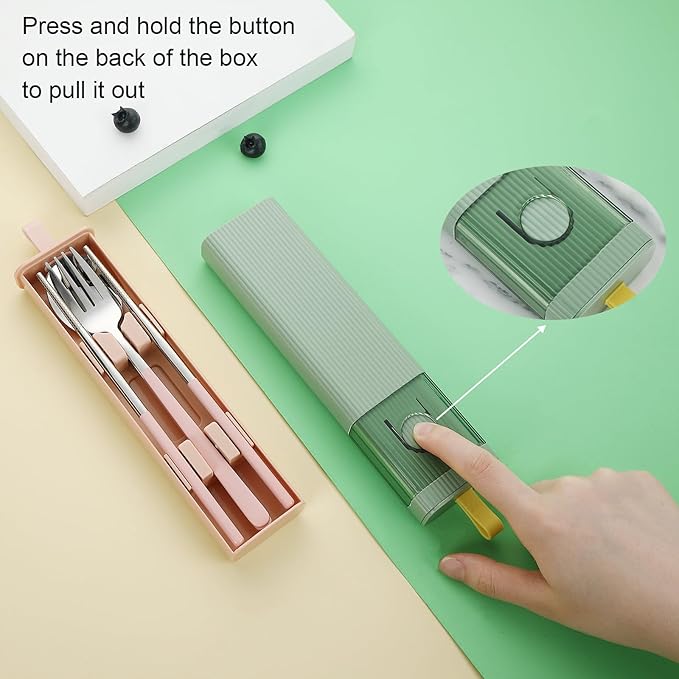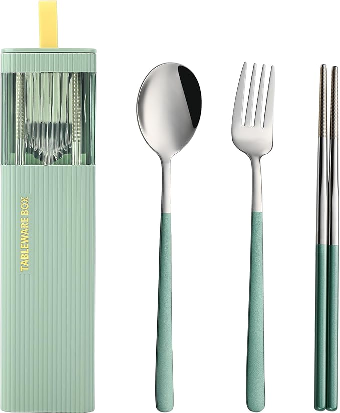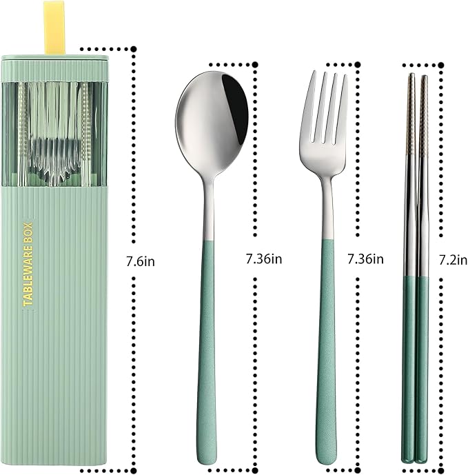 - Modern Design: This travel utensil set contains 1*fork-7.36 in, 1*spoon-7.36 in,1-pair chopsticks-7.2 in. More suitable for teens and adults. Mirror polished, no sharp edge. Removable silverware trough, reduce noise and easy to clean