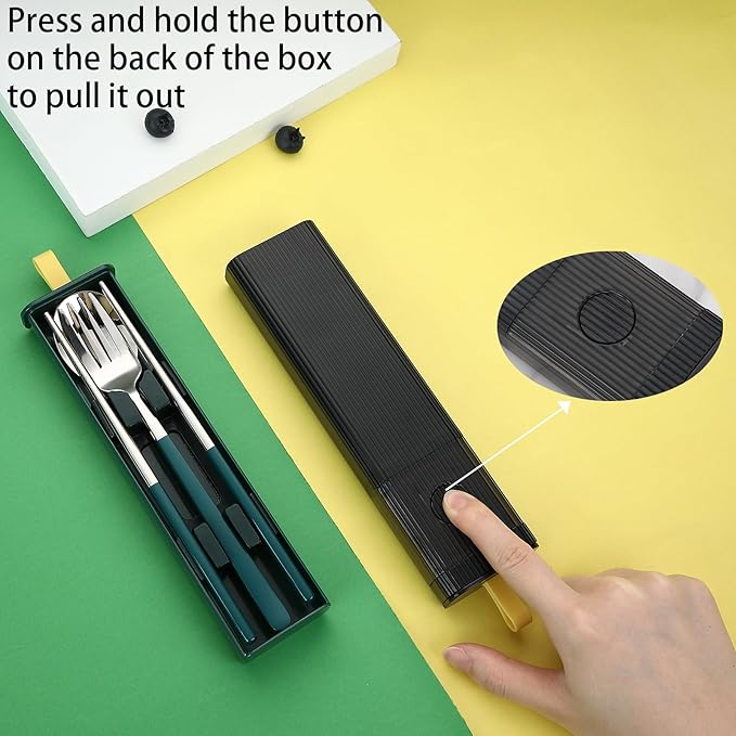 - Modern Design: This travel utensil set contains 1*fork-7.36 in, 1*spoon-7.36 in,1-pair chopsticks-7.2 in. More suitable for teens and adults. Mirror polished, no sharp edge. Removable silverware trough, reduce noise and easy to clean