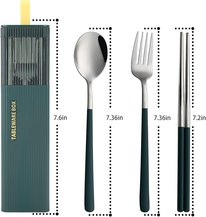 - Modern Design: This travel utensil set contains 1*fork-7.36 in, 1*spoon-7.36 in,1-pair chopsticks-7.2 in. More suitable for teens and adults. Mirror polished, no sharp edge. Removable silverware trough, reduce noise and easy to clean