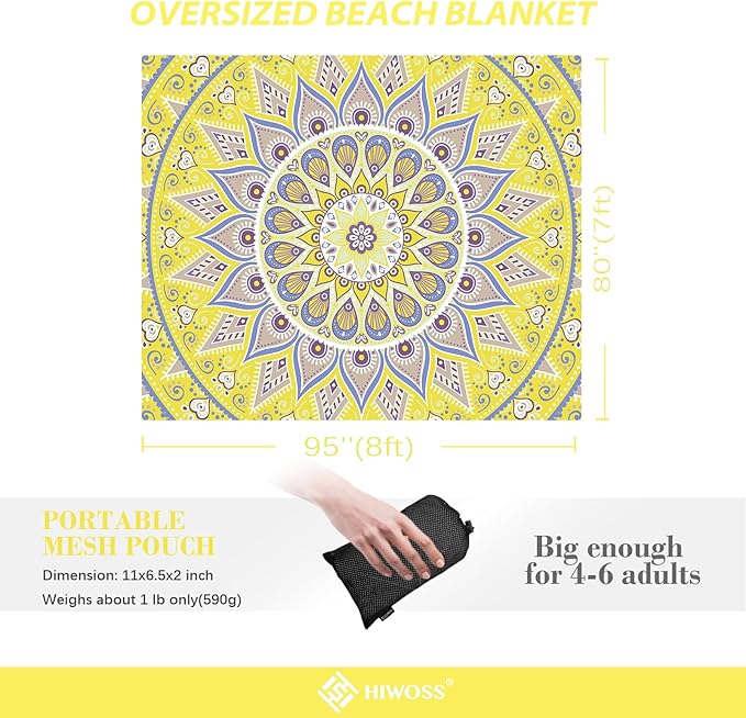Beach Blanket Waterproof Sandproof Oversized 95”x 80”,Sand Free Beach Mat with Corner Pockets,Portable Mesh Bag for Beach Festival,Picnic,Travel and Outdoor Camping (Yellowtan)
