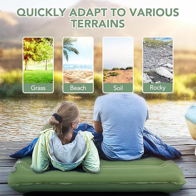 - 【Easy Inflation & Deflation】Easy to inflate by stepping on a built-in foot pump. Just take it out of the drawstring bag, unroll, close the plug under the pillow side, open the valve where the sponge pump is, step or press till full, and close the valve. The self-inflating pump is so convenient when outside, no more blowing up mattresses with mouth or lugging around a separate pump.