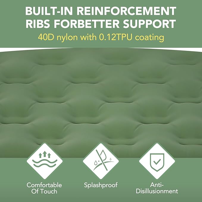 • 【40D nylon polyester & multi-layer TPU】:This camping bed mat is made of ultra-tough 40D nylon and inner waterproof TPU sealing coating, keeping you warm off the ground and keeping you from lying on the cold or rocky ground. the soft and cozy flocked top with a nice touch, keeping quiet when rolled over no squeaking for a comfortable night's sleep under the stars.