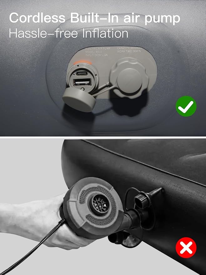 - Cordless Built-in Air Pump for Hassle-free Inflation: Equipped with a built-in air pump, this car air mattress inflates with just 1 press of a button, freeing your hands and making setup quick and easy. Taking just 2 minutes to fully inflate. A Type-C to USB charging cable is included for easy recharging. A fully charged pump can inflate and deflate the car mattress about 10 times. The high-quality black valve next to the pump allows for convenient inflation and deflation