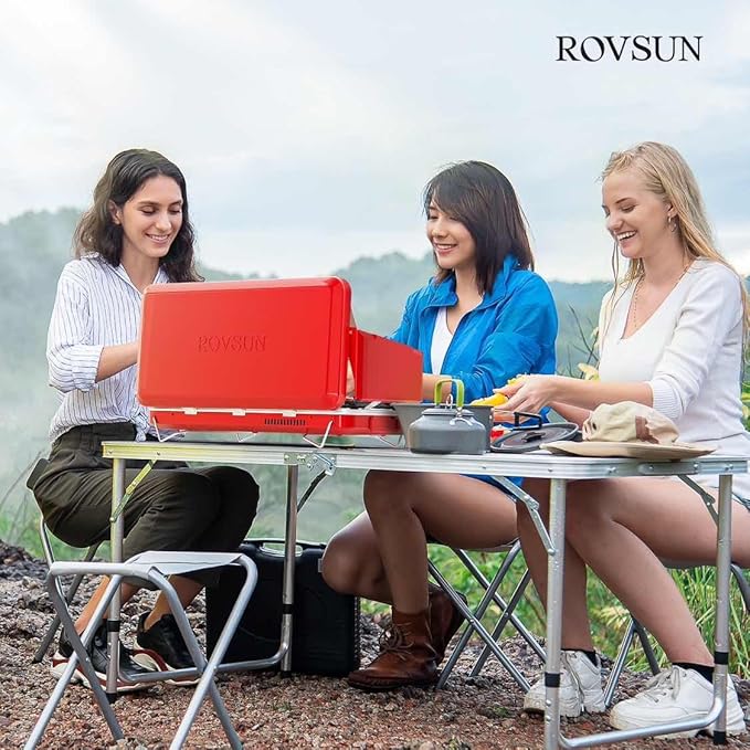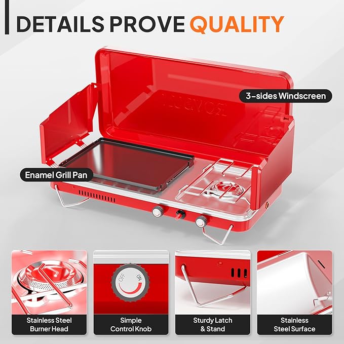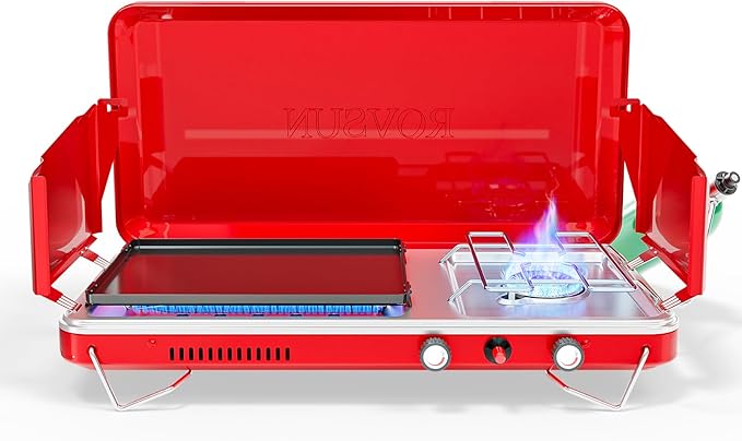 ROVSUN 2-in-1 Portable Camping Stove & Propane Grill with Enamel Griddle & Piezo Igniter, Tabletop Camp Stove with Built-in Handle, Wind Panel & Regulator for Camping, Tailgating, Grilling (Red)