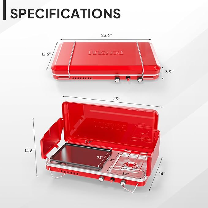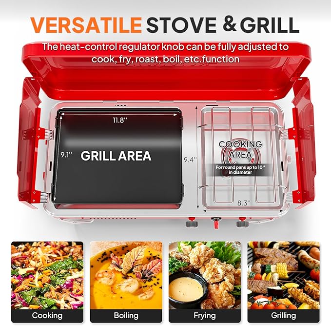 - 【2-IN-1 DESIGN】The combination design of the stove and griddle allows you to make delicious French toast, frying meat, grilled shrimp, grilling hot dogs, sandwiches, Mexican tortillas, etc. The high-quality griddle can quickly heat up through automatic ignition and provide precise temperature control through the knob