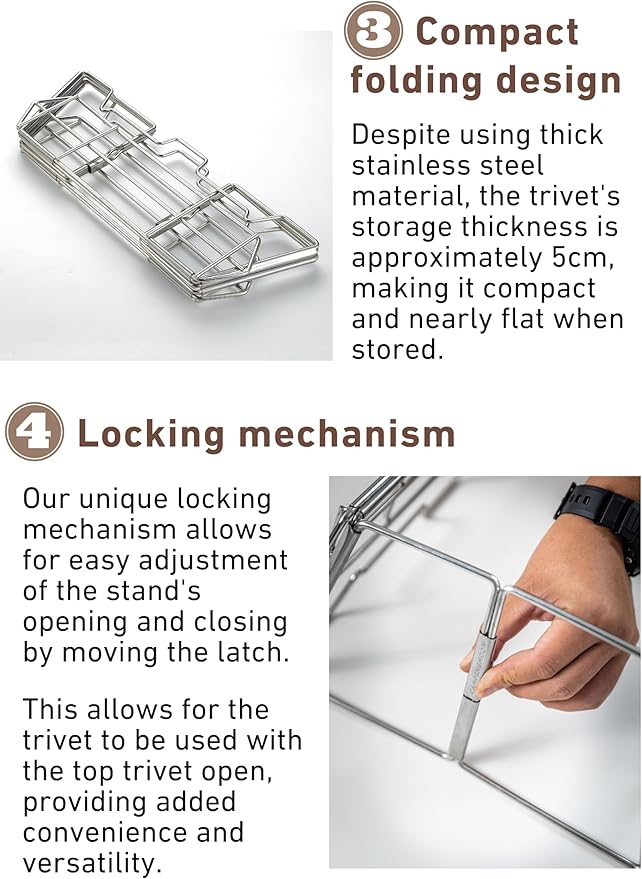 - 【Stand Stability】Our unique locking mechanism allows for easy adjustment of the stand's opening and closing by moving the latch. This allows for the trivet to be used with the top trivet open, providing added convenience and versatility.