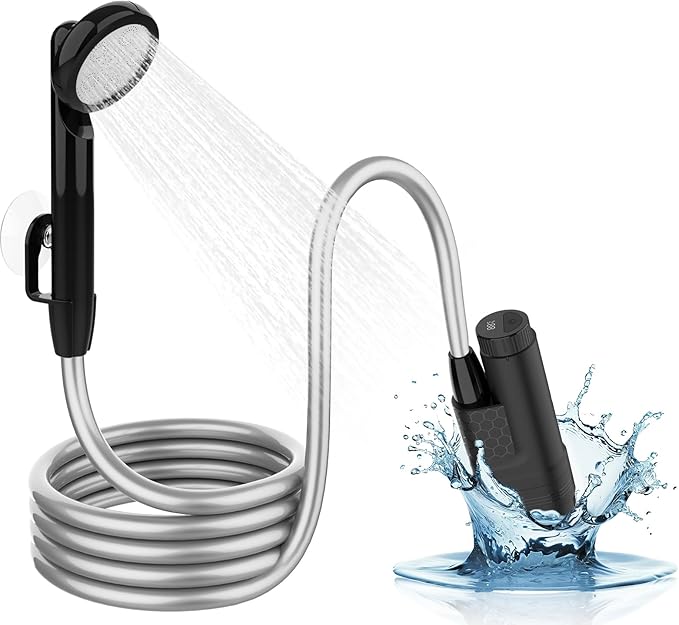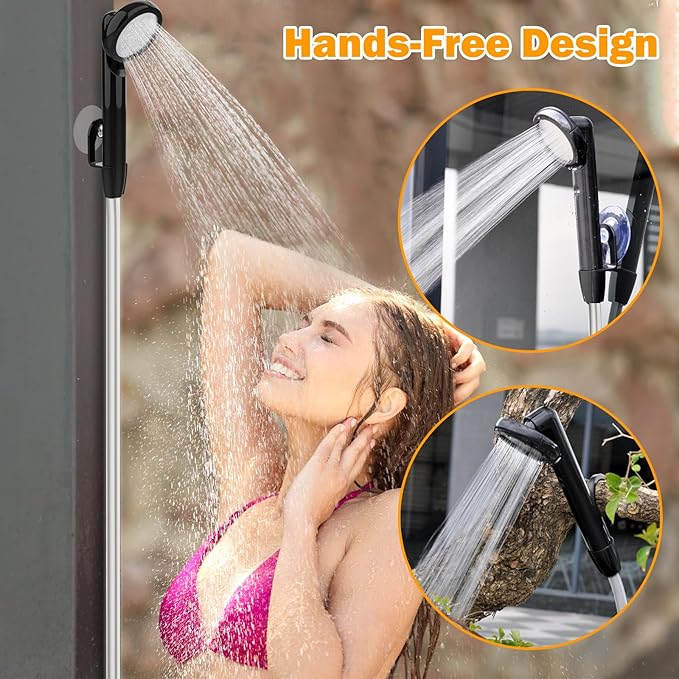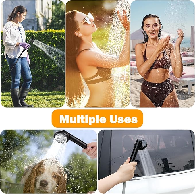 - ON/OFF Shower Head: With innovative design of built-in on-off valve, you can control the water flow from on to off and adjust the intensity of water flow by tilting the shower head at different angles, a plus for convenience and saving water. The water outlet of portable camping shower has stainless steel flat surface and fine holes, easier to clean and hard to accumulate dirt like traditional shower head. The portable shower head is light and handy, even kids can grip it without effort