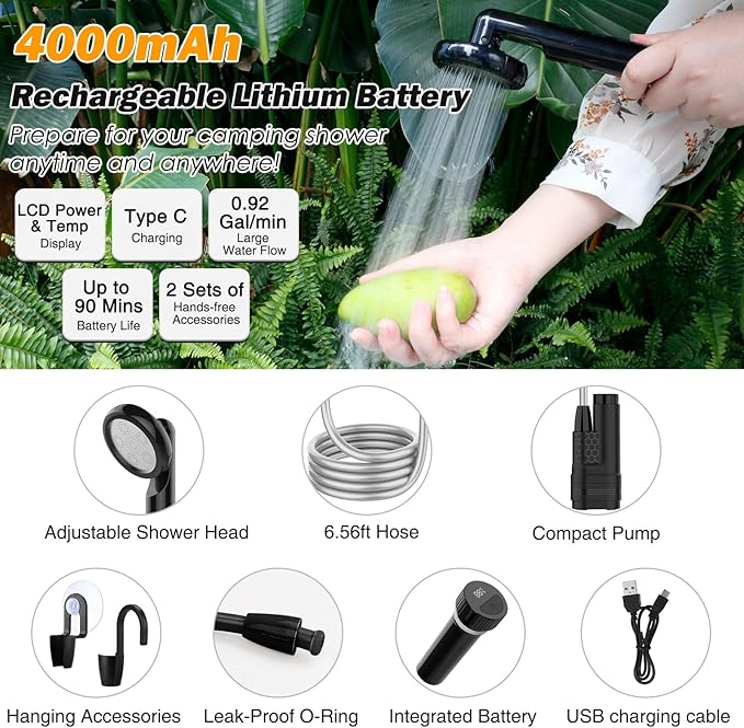 - Rechargeable Shower with Larger Capacity: The outdoor camping shower comes with a USB rechargeable 4000mAh battery,which can work continuously up to 90 minutes if full charged by power bank, phone adapter, laptop, car USB output.The split type battery is more convenient to recharge separately.This outdoor shower kit comes with suction cup and S hook which allow you to hang the shower head overhead or mount on any flat surface like car window, help you enjoy a convenient and hands-free shower