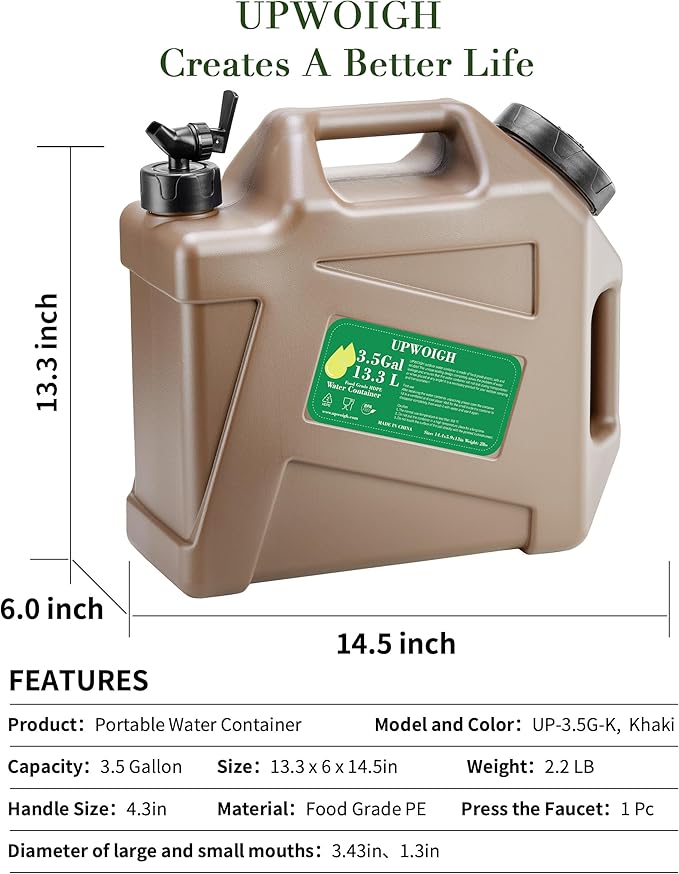 3.5 Gallon Water Jug,Overlanding Gear Water Containers Spigot,Camping Essential Truly Leak-Proof Press Faucet Khaki Water Tank,BPA Free Portable Emergency Water Storage for Outdoors and Hiking