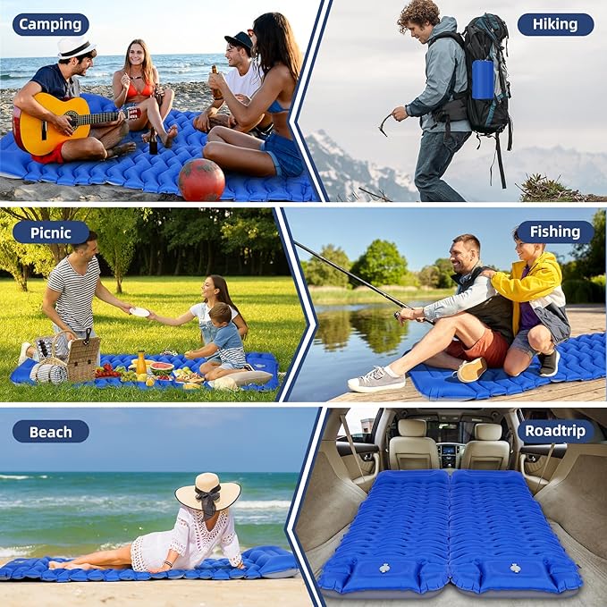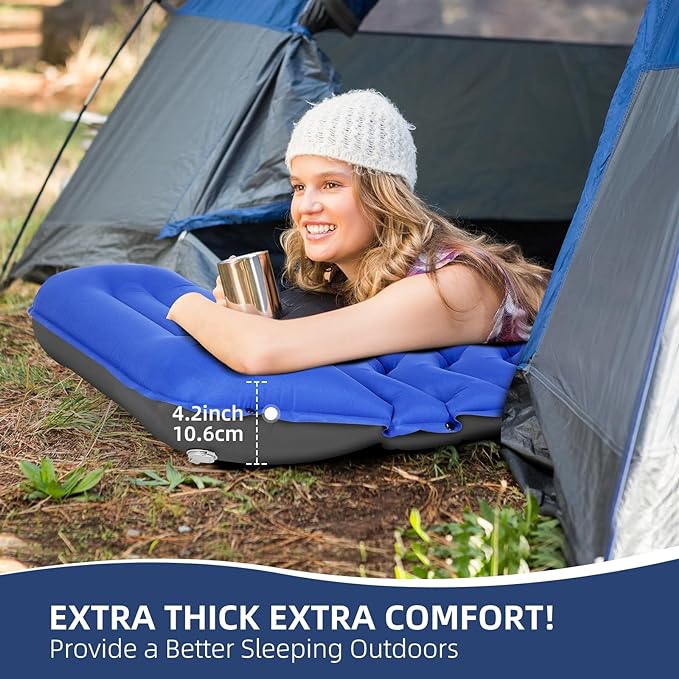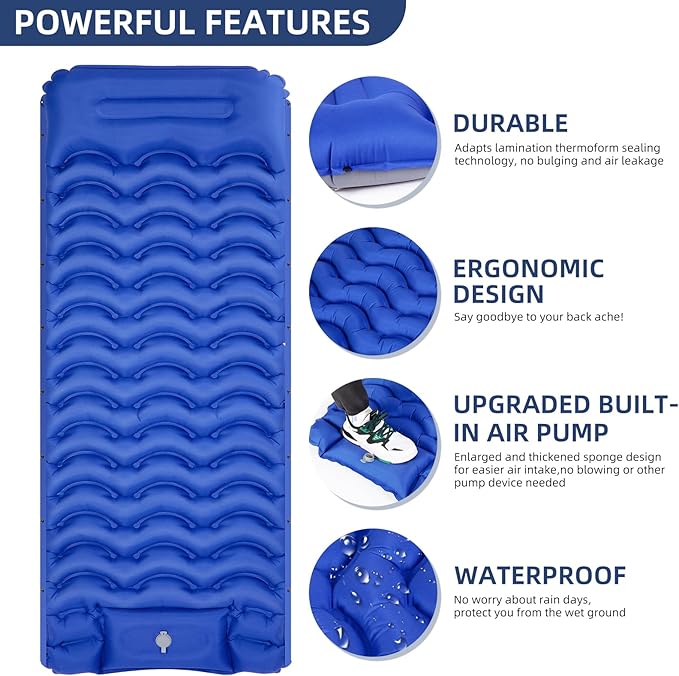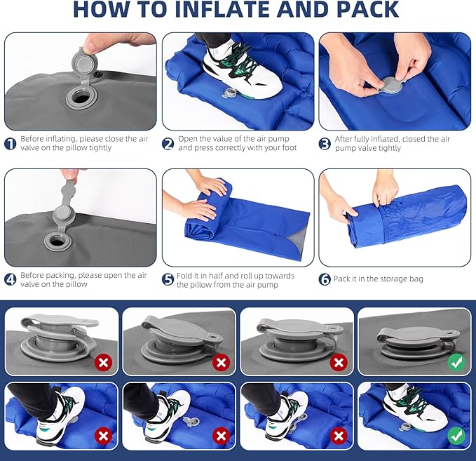 - 【Foot Press to Inflate-Only 30s Needed】 There is no need to inflate with your hands, mouth, or a pump for our camping sleeping pad. It just only takes 20s after you inflate the sleeping mat fully by stamping the spot of the built-in pump with your foot.With anti-leakage films in the valves, you would never worry about air leaking when using it! Besides, super quick to deflate.It's time to plan a camping and hiking with our innovative camping sleeping pad now!