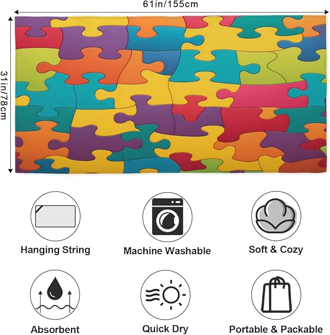 Colorful Jigsaw Puzzles Pattern Beach Towel Oversized Quick Dry Beach Blanket Microfiber Sand Free Absorbent Lightweight Bath Towel for Pool Travel Swimming Camping Women Men, 30" x 60"