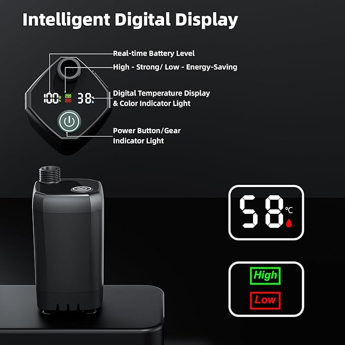 - 【Intelligent Digital Display】 The LED display of this portable water pump offers a clearer view of the power status and immediate water temperature reading, with a range of 32-140°F (No Heating Function). There are two power battery modes, “High” & “Low”. The green/blue/red colors next to the water temperature value represent different temperatures respectively. The camping shower pump screen allows you to avoid heat burns and sudden power outages.