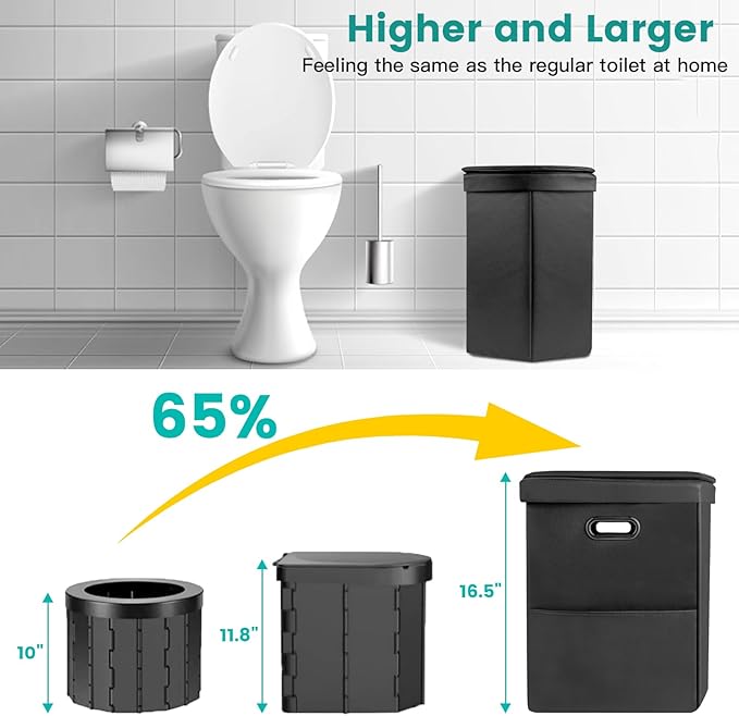 - Extra Large and More Comfortable: Are you looking for a portable toilet that is just like the one in your home? Here it is! This Upgrade portable toilet is 13.8"L*12.2"W*16.5"H.That is higher, wider and rectangle toilet seat offer more rooms than most other collapsible toilets. Which is more suitable for adults, bring you more relax and comfortable experience when outside.