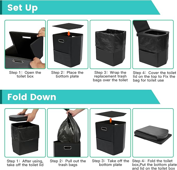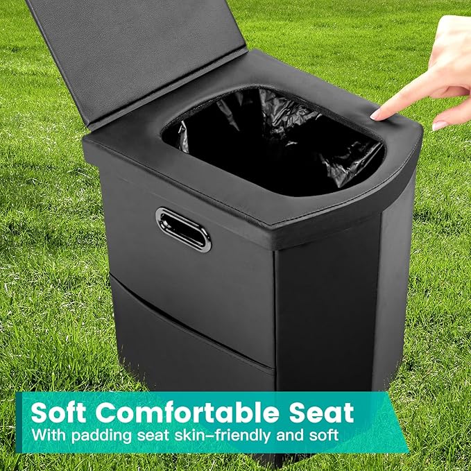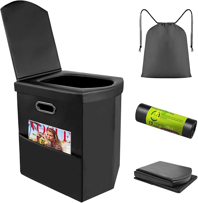 - PACKAGE: 1 x Portable Toilet with lid, 1 x Exquisite Packaging Box, 1 x Carry Bag, 15 x Replacement Trash Bags. Worry-free warranty, and friendly customer service.(If you need more Replacement Trash Bags, you can search for ASIN: B0CMXSJHTN).